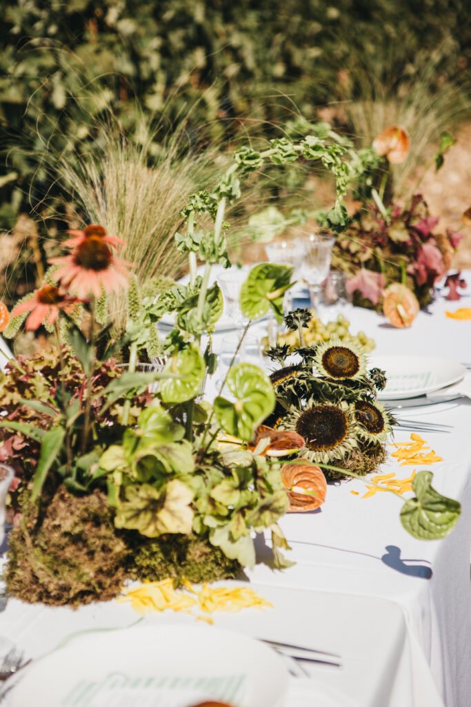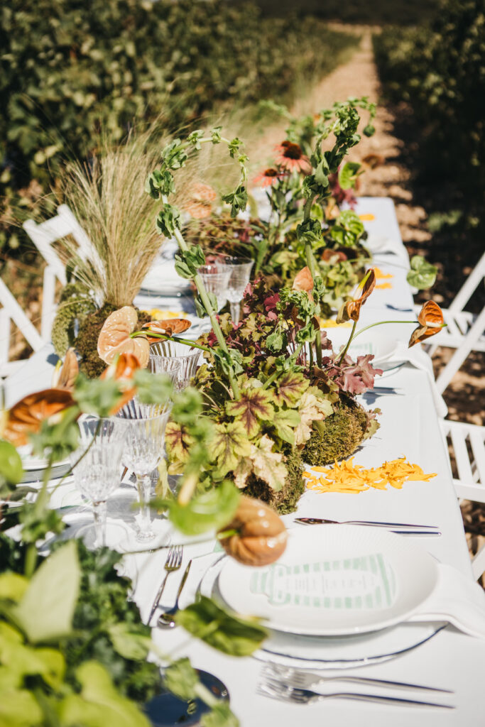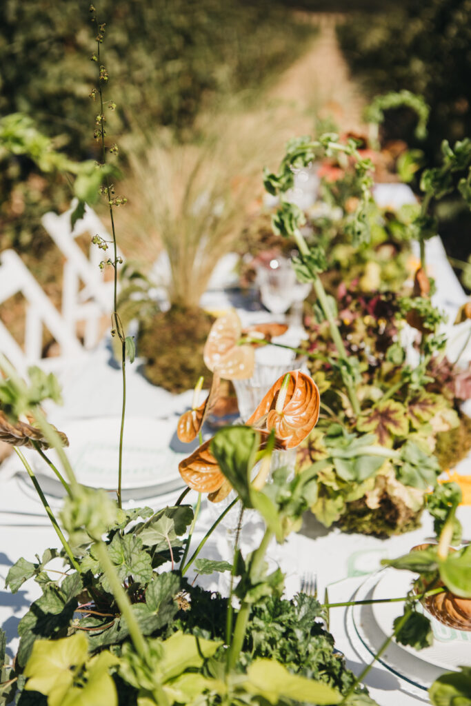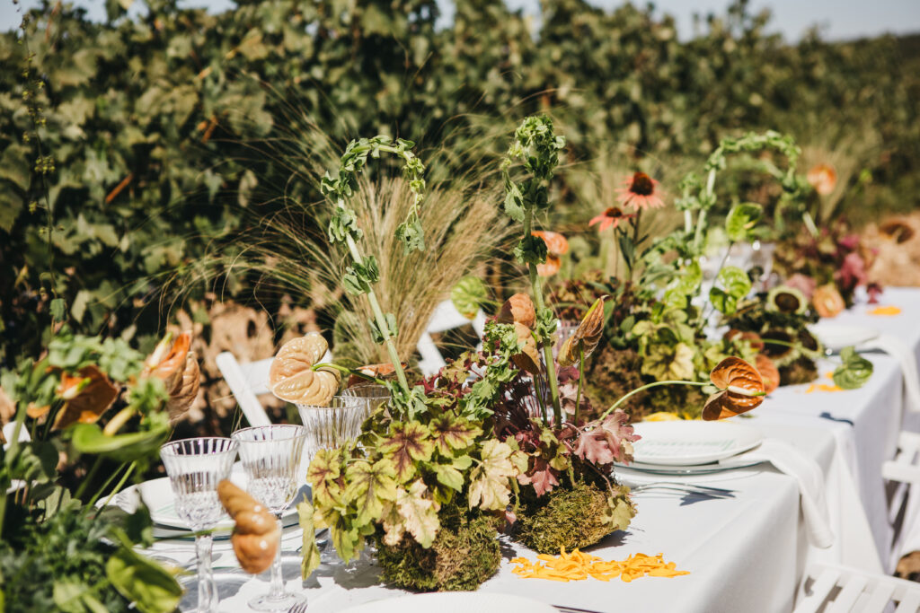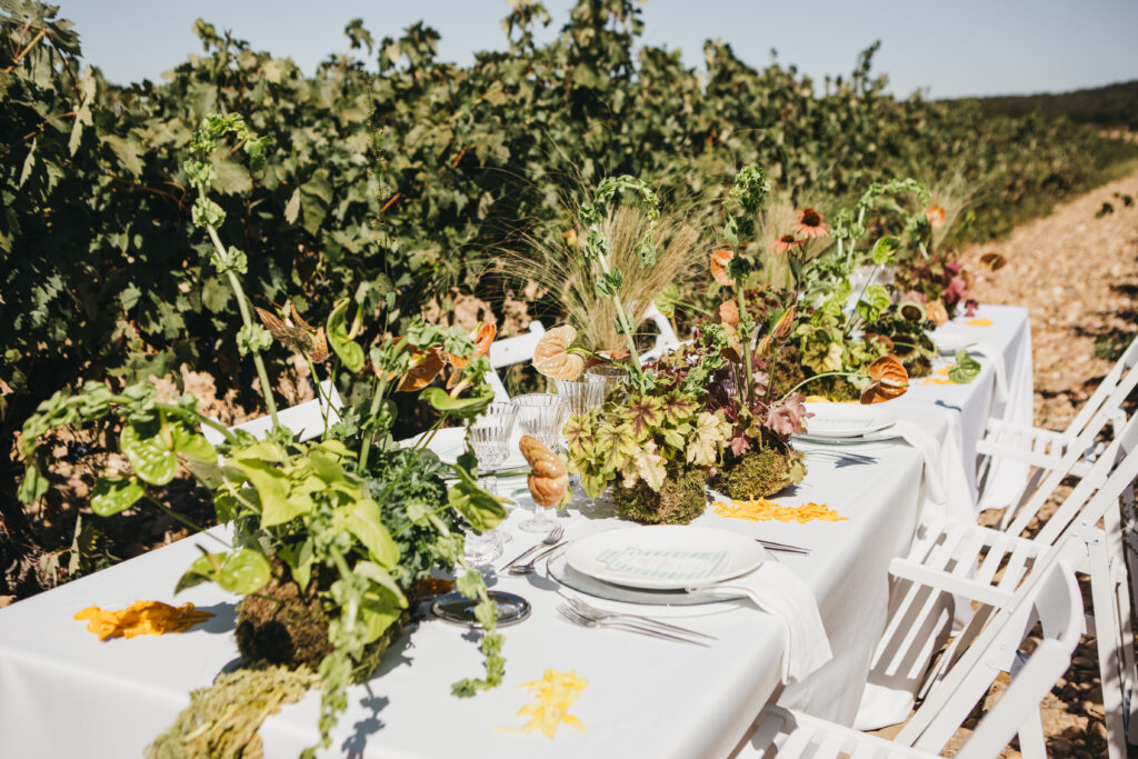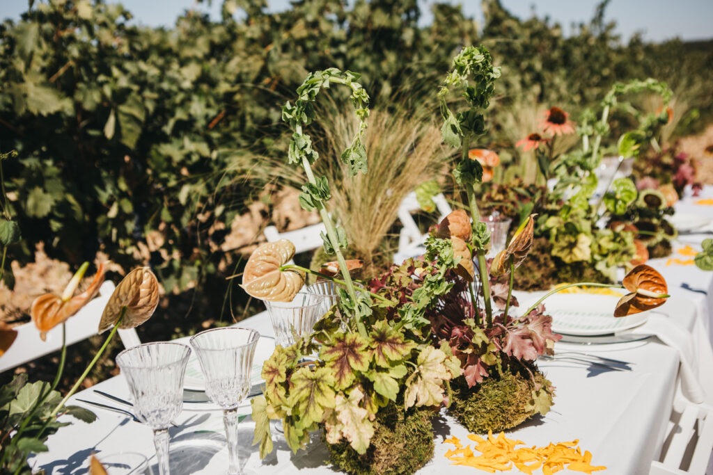 Aunque contábamos con un entorno natural e idílico, queríamos darle ese toque de distinción y creatividad. Como nos cuenta Rubén, “aposté por una mesa imperial limpia, donde el paisaje invadiera el montaje. Centros con plantas naturales, verdes intensos, rojos y teja jugando con flores en diferentes alturas que aportaban frescura y movimiento“.