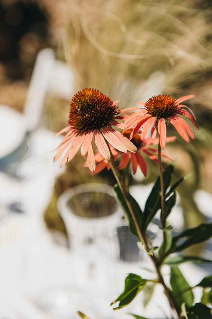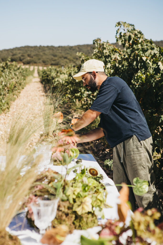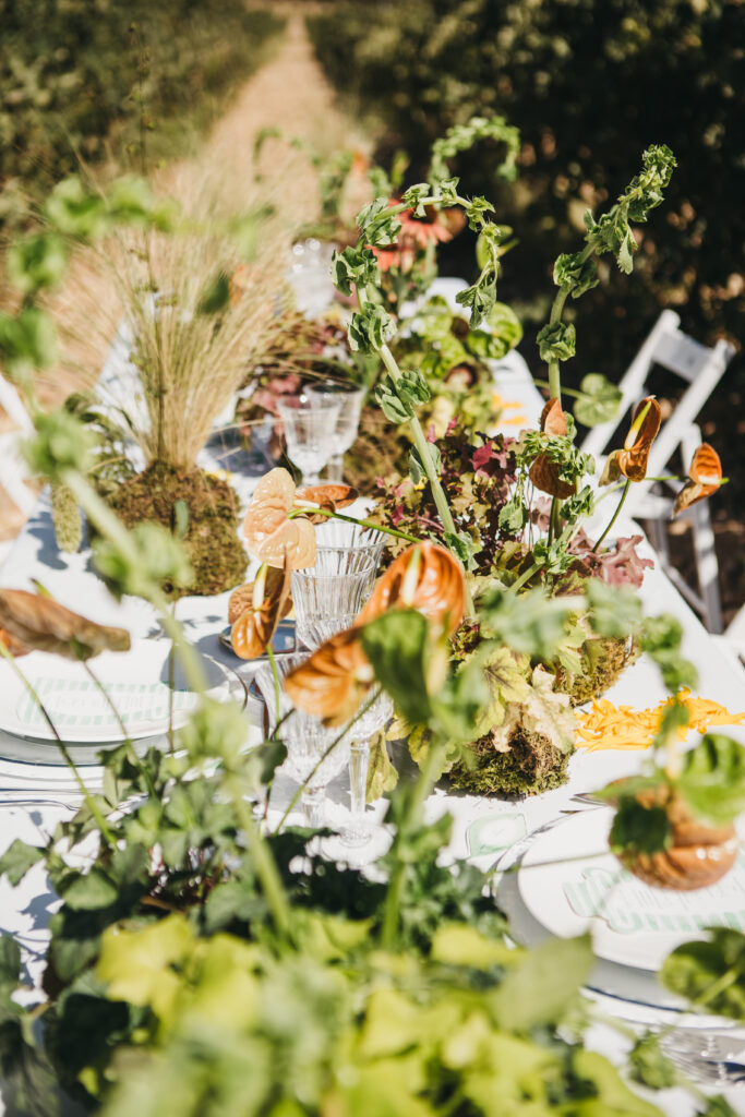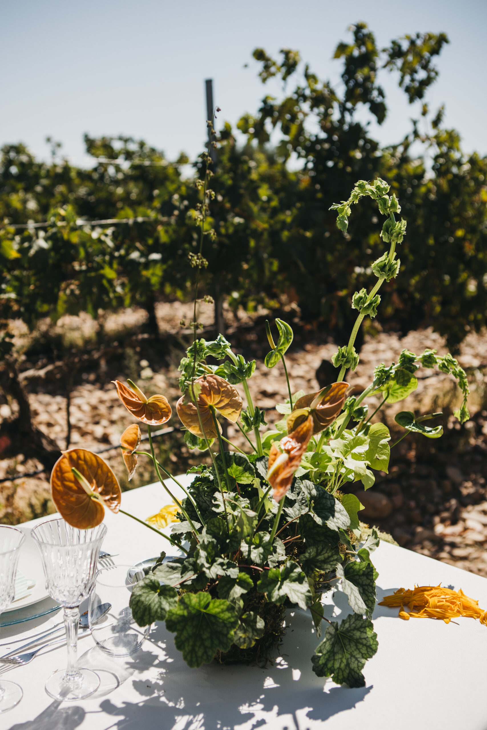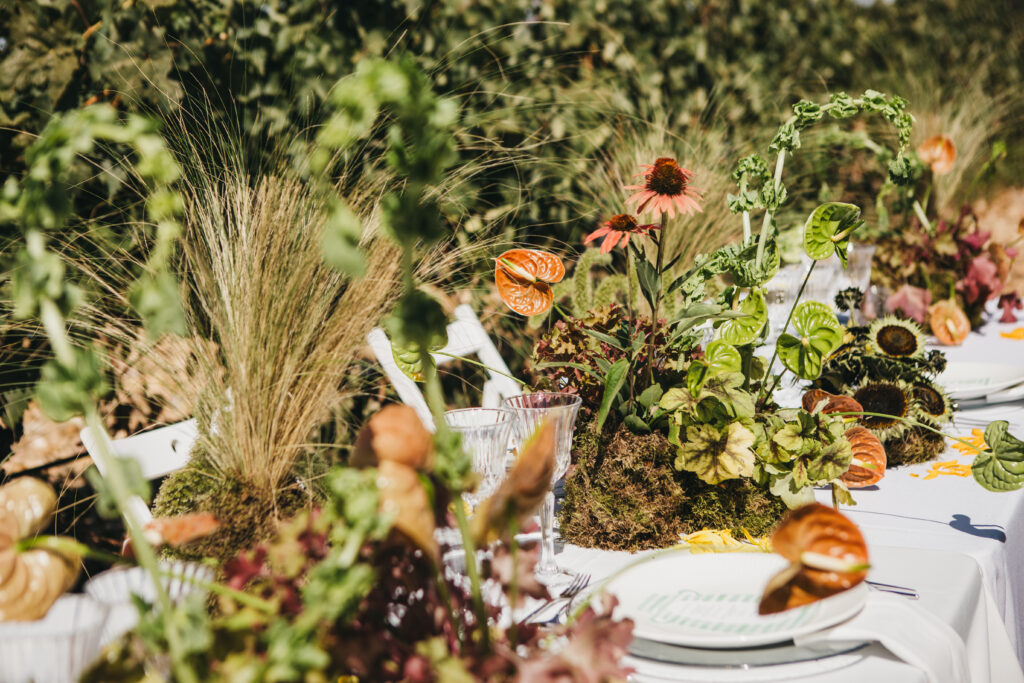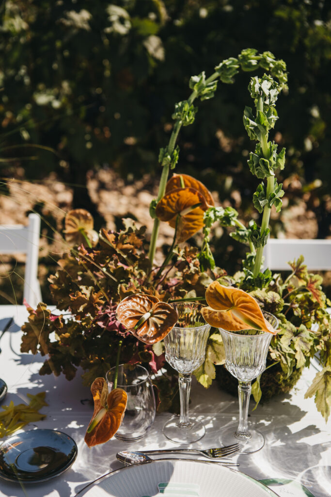 Aunque contábamos con un entorno natural e idílico, queríamos darle ese toque de distinción y creatividad. Como nos cuenta Rubén, “aposté por una mesa imperial limpia, donde el paisaje invadiera el montaje. Centros con plantas naturales, verdes intensos, rojos y teja jugando con flores en diferentes alturas que aportaban frescura y movimiento“.