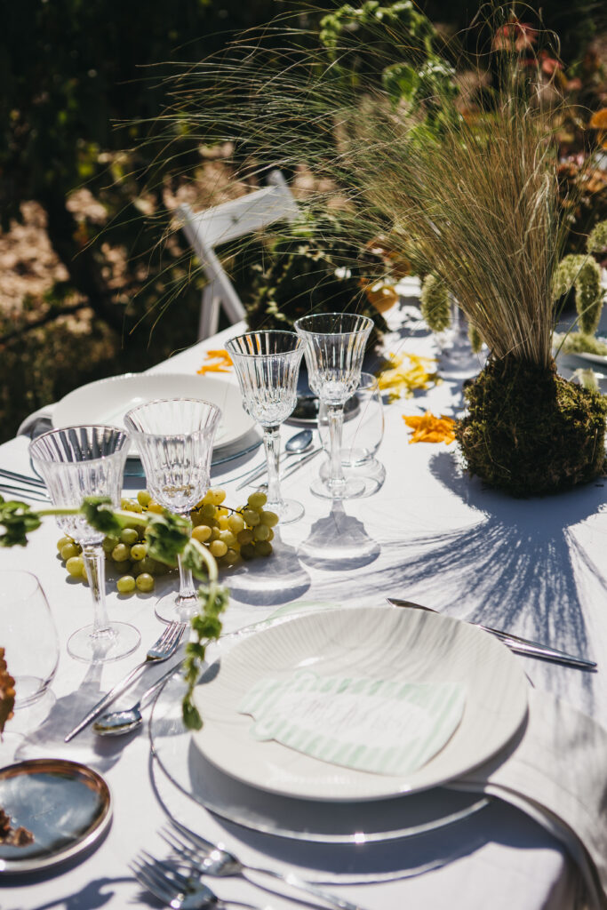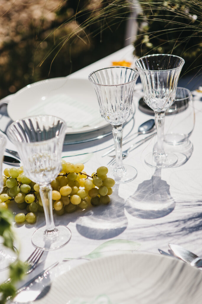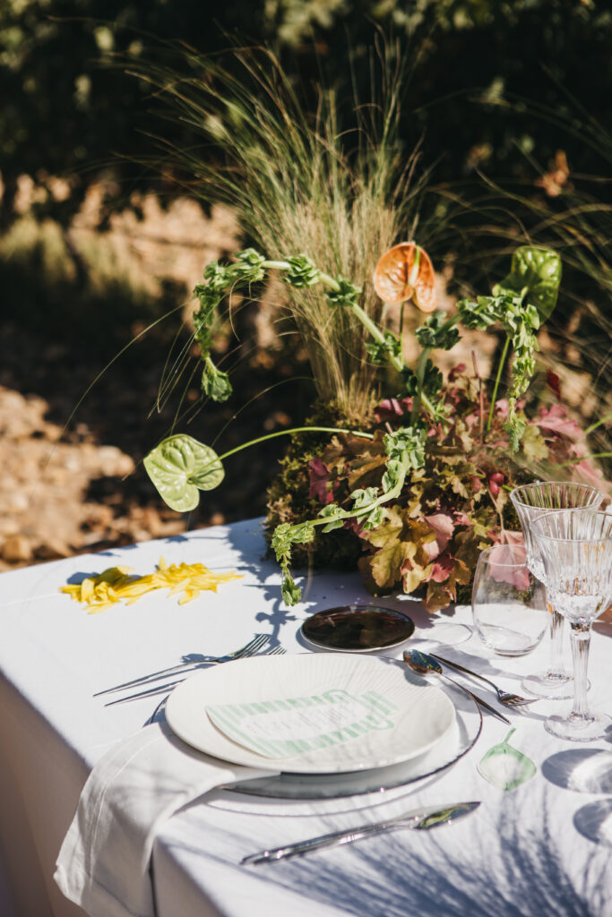 Cada vez son más las bodas y eventos en los que vemos la mantelería rústica en blanco. En esta propuesta era la opción perfecta, para resaltar el maravilloso entorno y para jugar con el color protagonista, el verde. Para ello contamos con la mantelería y el menaje de Attrezzatura, proveedor de confianza que nos acompaña en muchos de nuestros eventos.