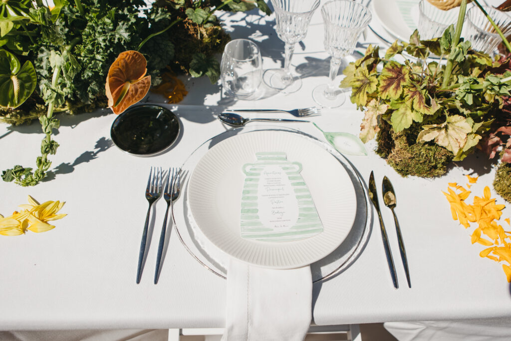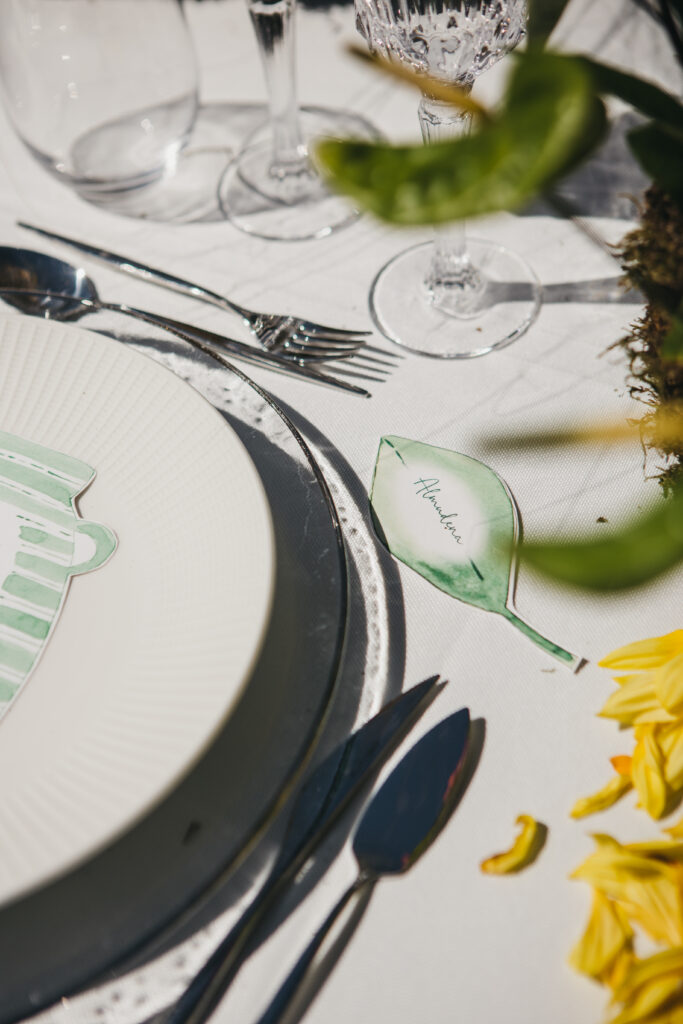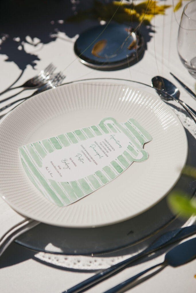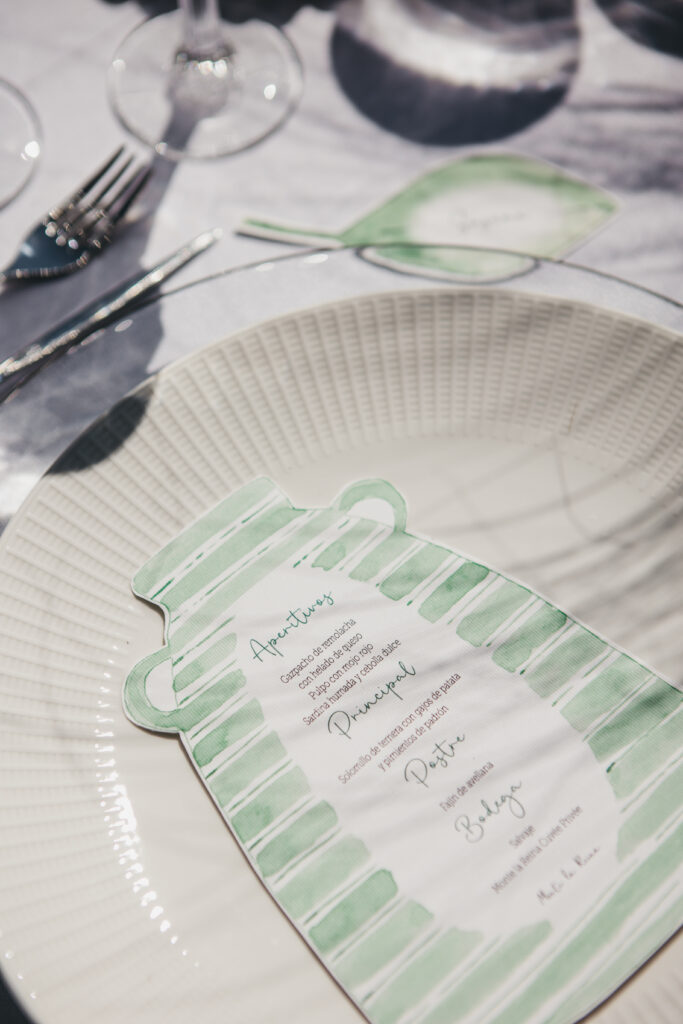 Almudena diseñó unas minutas “en forma de jarrón de barro, elaborada en papel con textura especial y trabajada a mano para conseguir un acabado irregular que recordase a la cerámica”. Y creó unos marcasitios “en forma de hojas verdes, manteniendo la relación con el entorno y aportando frescura a la mesa”.