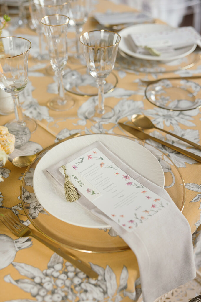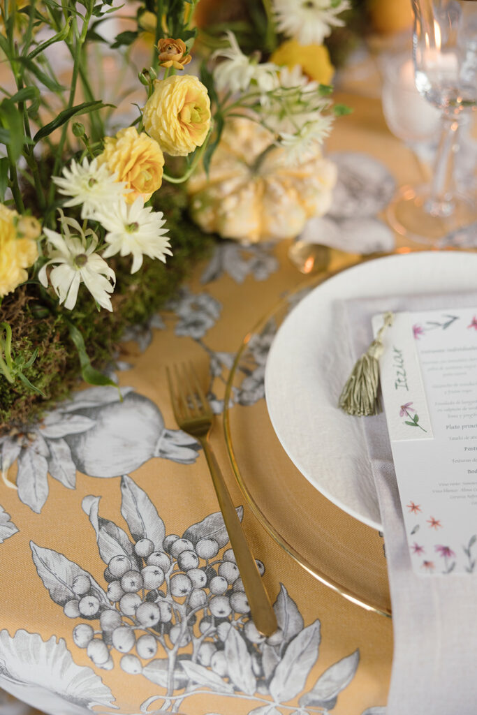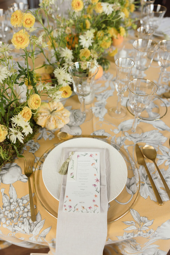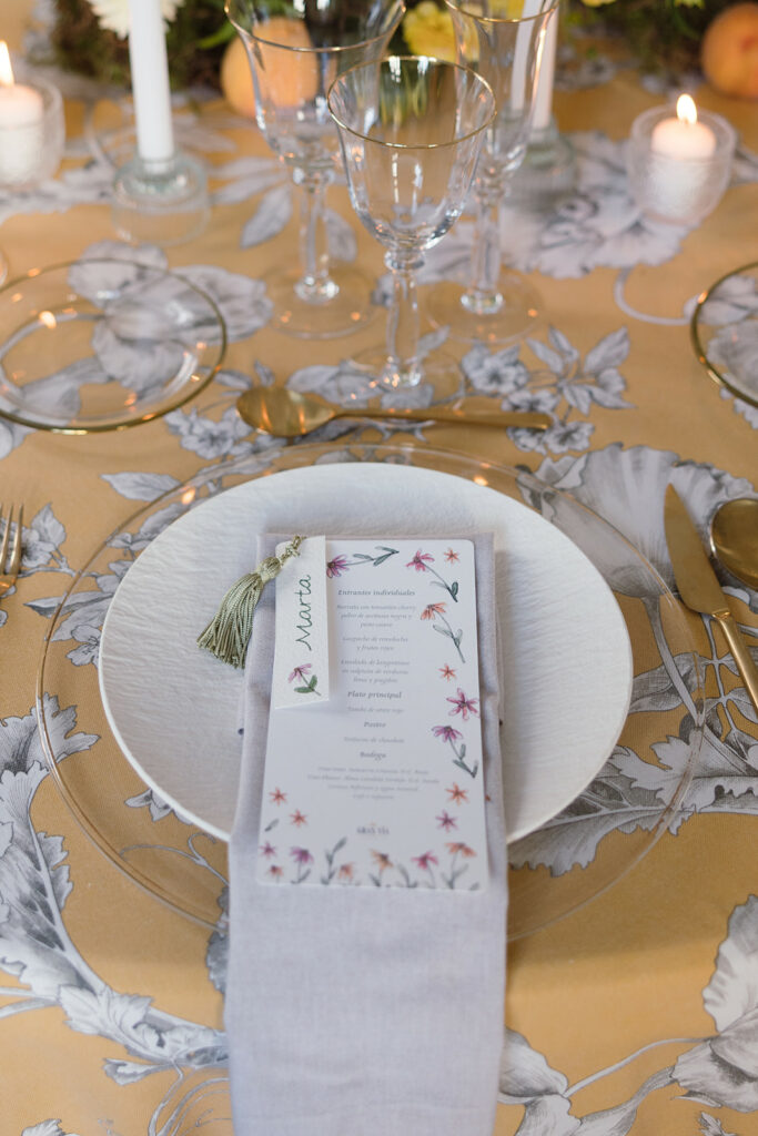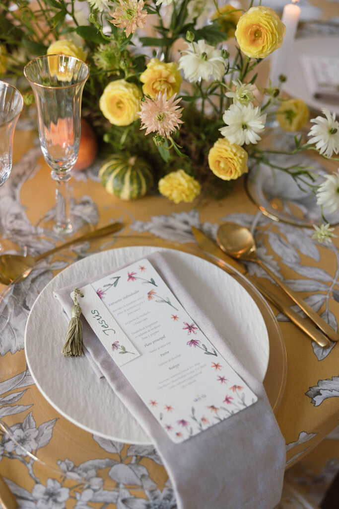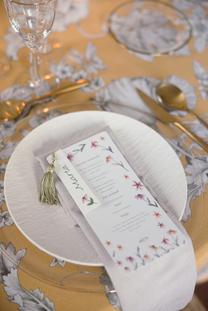 Apostó por unas minutas rectangulares, “con ilustraciones en acuarela de flores para aportar un toque llamativo y lleno de vida“. Y unos marcasitios realizados a mano “en papel de algodón con una textura más elegante y natural, caligrafiados uno a uno e ilustrados con pequeñas flores únicas”. Cada marcasitio se unía a la minuta con una borla verde claro, “generando un detalle dinámico y visualmente muy cuidado”.