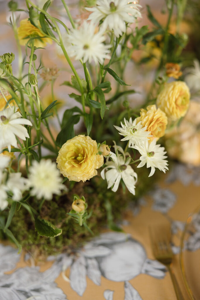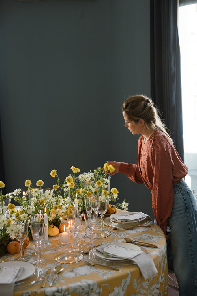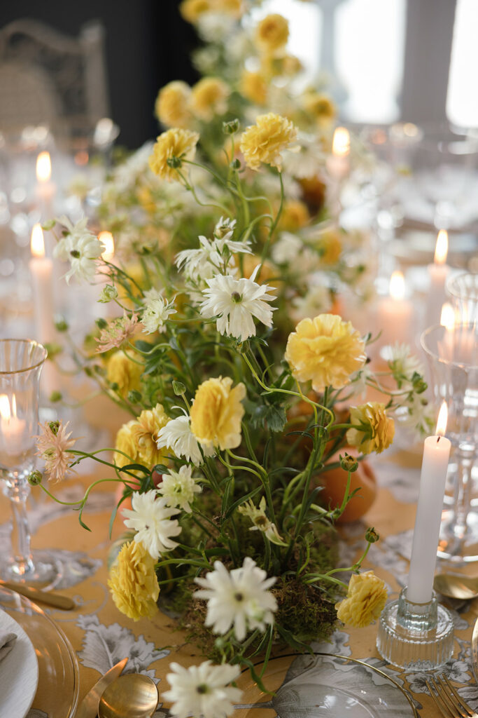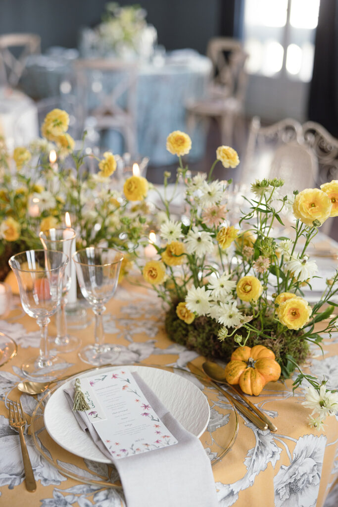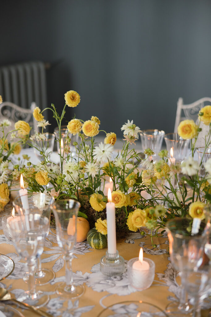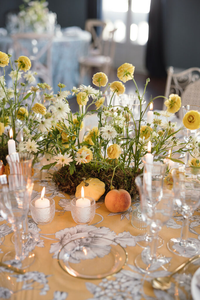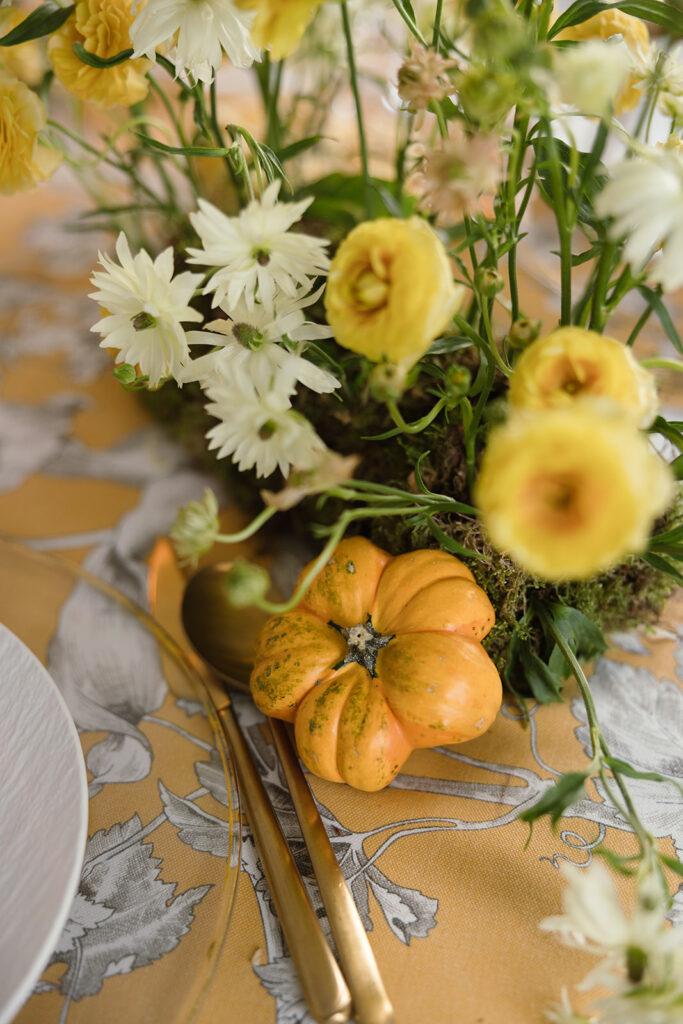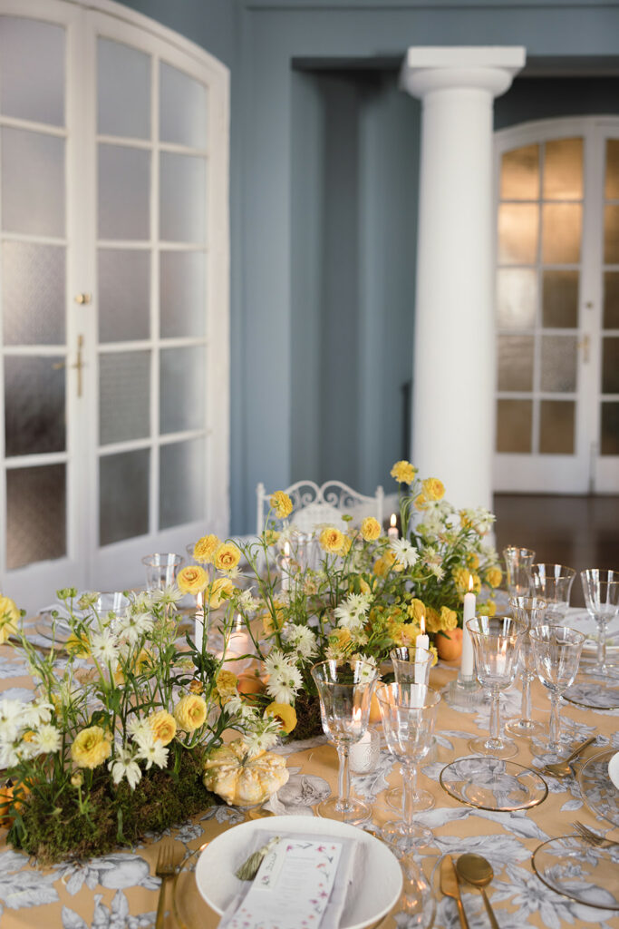 Como nos cuenta, esta primera mesa, “la imaginé como un pequeño homenaje al otoño, con una base de musgo que parecía surgir de la mesa y una mezcla de ranúnculos en tonos dorados, blancos y melocotón”. Y entre ellos, “pequeñas calabazas y melocotones que aportaban textura y ese punto inesperado” que me encanta.
